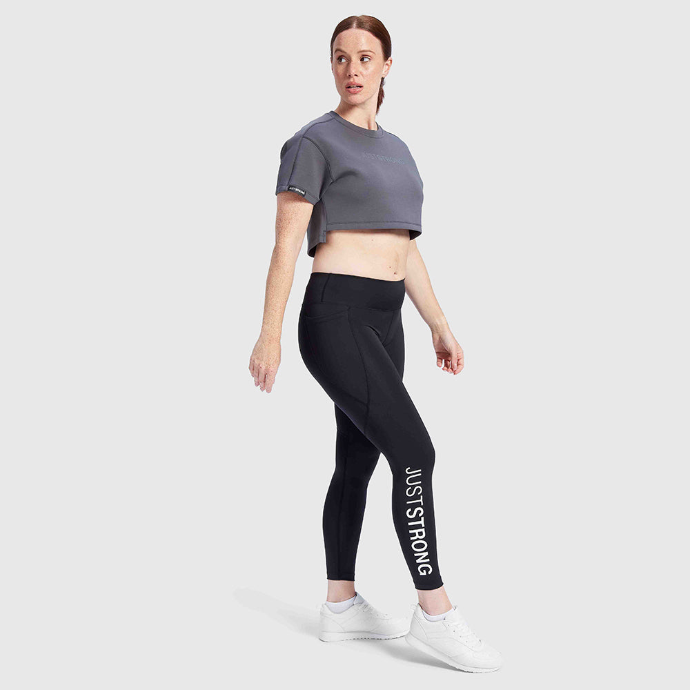 These oversized athletic cropped T-shirts are made some a super breathable fabric that feels luxurious to the skin. Perfect for any sort of workout. JustStrong detail badge on the arm and a tonal print to the center chest for a minimalistic, quality design.